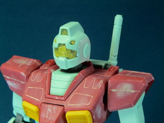 「RGM-79 ジム(バズーカ装備仕様)」つづきです。 頭部はMG独特の角ばり感が気になったので、丸くするようにしました。作業中の写真です。 幅増しはパテを使用しましたが、後で耳(?)パーツを取り付ける際に、縁のエッジが欠けてしまったので、後から耳サイズの穴を開けたプラ板で修正しました。 耳(?)のパーツは後から取り付けできるようにしておきました。